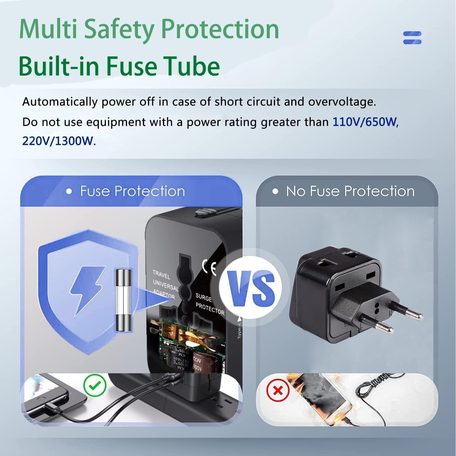 Multiple Safety Protection:This global Power Adapter built-In safety shutters protect users from the direct touch of the live parts on the socket outlet. Built-in 6.3A fuse, automatically cuts off power when current exceeds rated load. Provide over-current, over-voltage, Short-circuit Protection, surge protection.