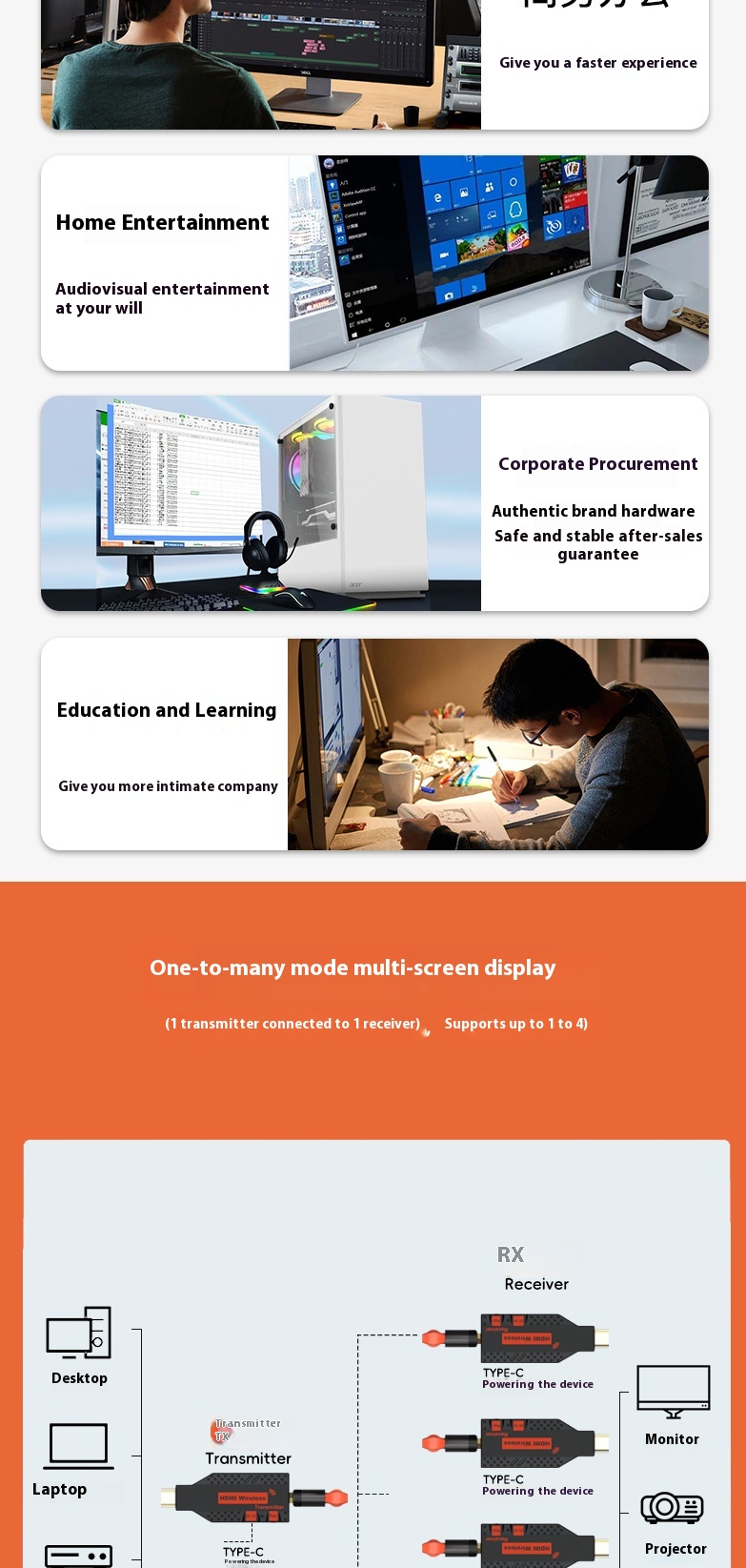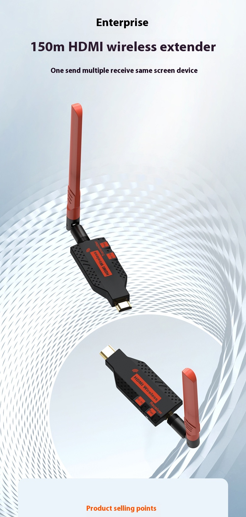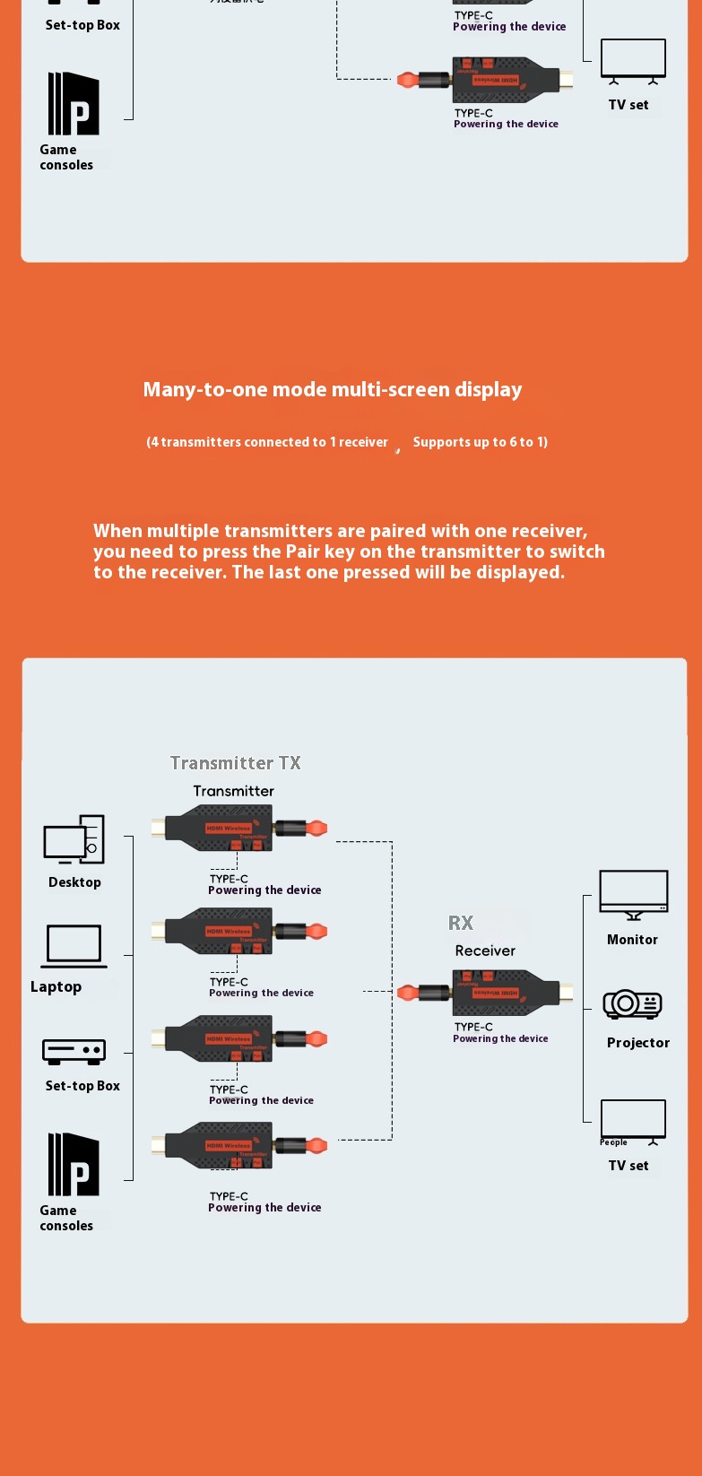 1* One transmitter, one receiver, two antennas, two USB power cables, one Chinese and English manual, two HDMI rotary female connection cables, and one HDMI female to female connector,